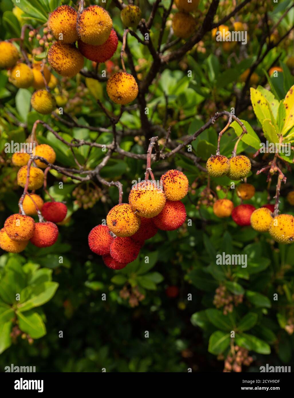 Botanical Collection Ripe Colorful Fruits And Flowers Of Arbutus Unedo Strawberry Tree Evergreen Shrub Or Small Tree In The Family Ericaceae Nativ Stock Photo Alamy